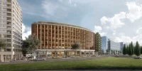 Five proposed buildings provide residential dwellings, with three offering affordable homes to buy or rent. Four buildings incorporate retail and commercial uses on their lower and ground floors, and one features a hotel. The sixth building features a cross-laminated timber office above a community space; its basement includes spaces for car charging and car sharing.